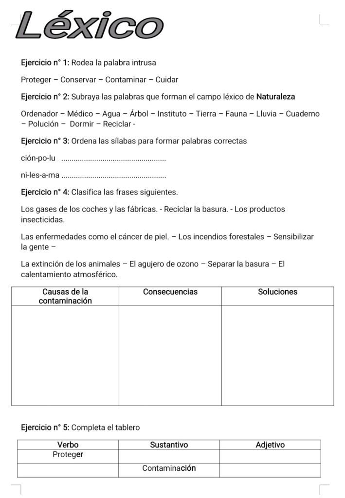 Ejercicios de léxico sobre la naturaleza.