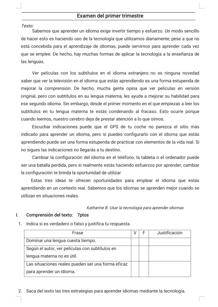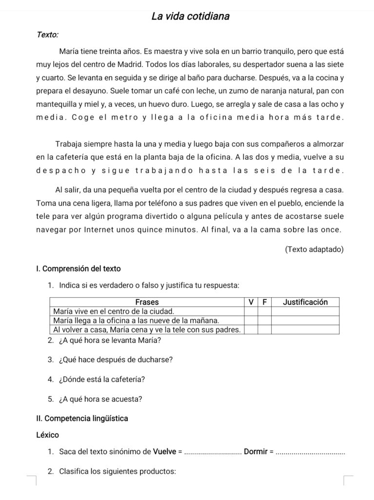 Prueba sobre la vida cotidiana destinada a evaluar la comprensión lectora, el vocabulario y la expresión escrita en contextos habituales del día a día.