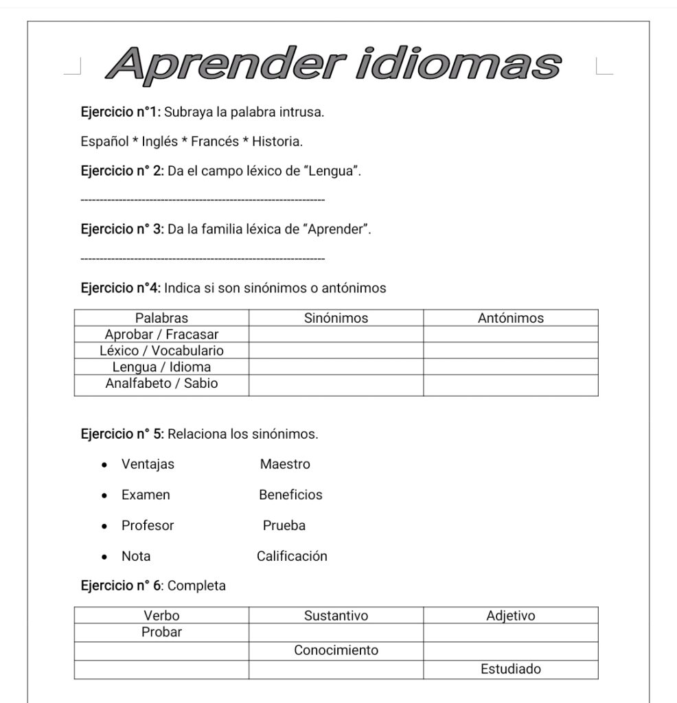 Ejercicios de léxico sobre el tema de aprender lenguas.