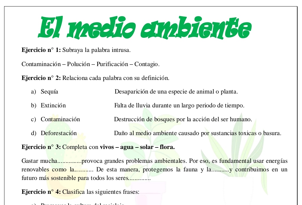Ejercicios de léxico sobre el tema del medio ambiente.