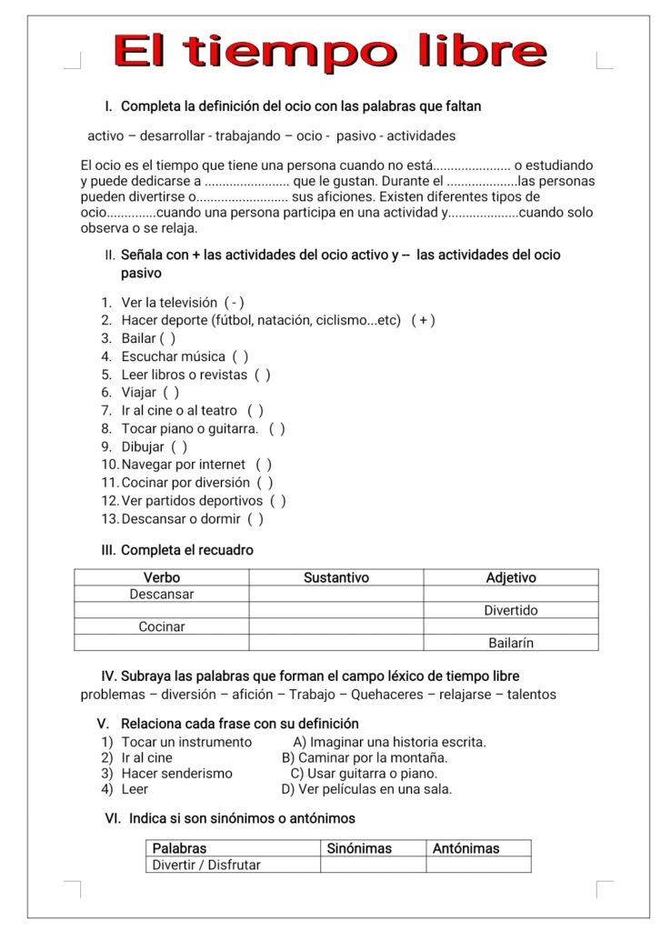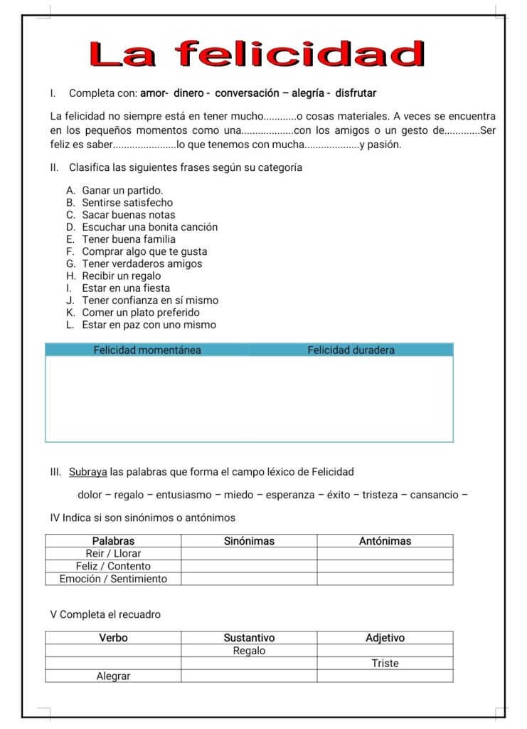 Ejercicios de léxico sobre la felicidad.