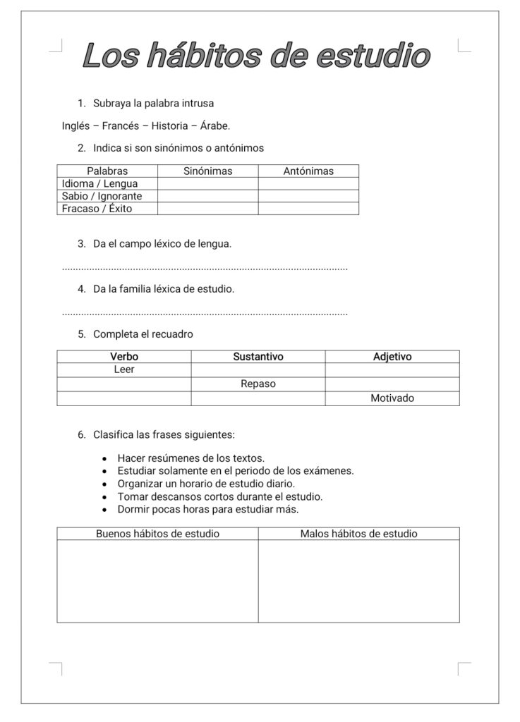 Serie de ejercicios sobre el tema de los hábitos de estudio.